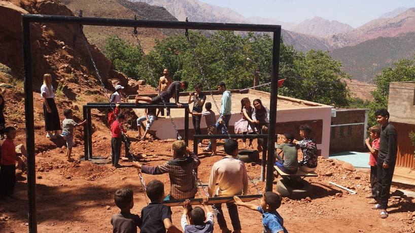 C’est ici, à 60 km au sud de Marrakech, qu’a vu le jour le projet d’architecture sociale et participative Hénaia, porté par les cinq jeunes architectes Antoine Gouachon, Constellations Studio (Estelle Poisson et Soraya Haffaf), Joséphine Louarn, Juliette Bénizeau et l’association Intervalle (représentée par Thibault de la Laurencie) à l’origine de la construction de l’école maternelle du village.
